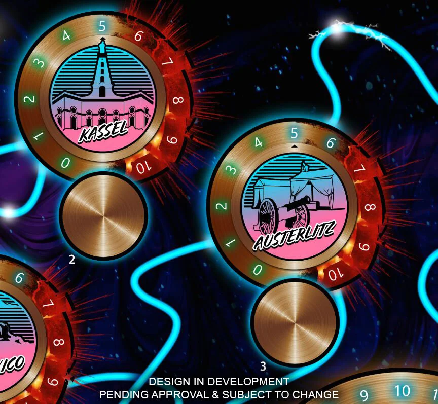 The game board in Bill & Ted’s Riff in Time has a twisting pattern showing the Circuits of History that link together ten points in time where time have opened - these rifts are represented by discs that can rotate to different values depicting the various states of the rift.