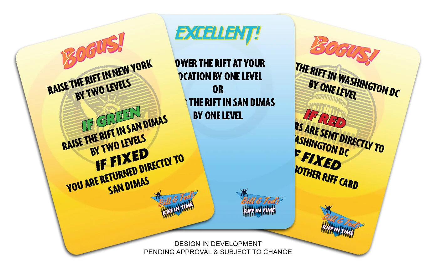 As we hurtle full speed into the holiday season, I thought I would take some time out from playtesting secret projects, to bring you up to date on the latest information about our upcoming most bodacious Bill & Ted’s Riff in Time boardgame.