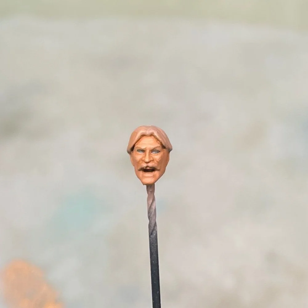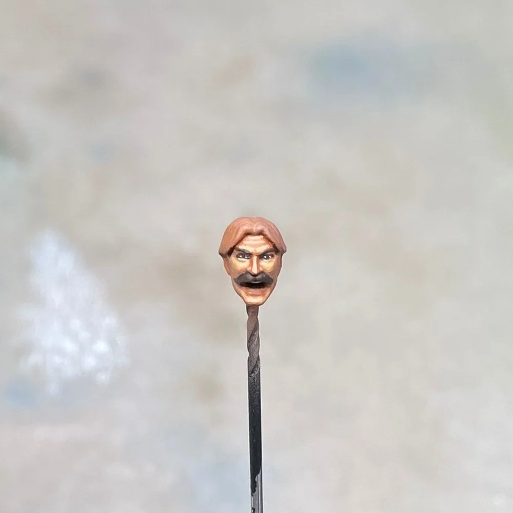 Step 10: Next, I painted the hair in with Umbral Umber and highlighted the moustache and eyebrows with a 50/50 mix of Umbral Umber and white.